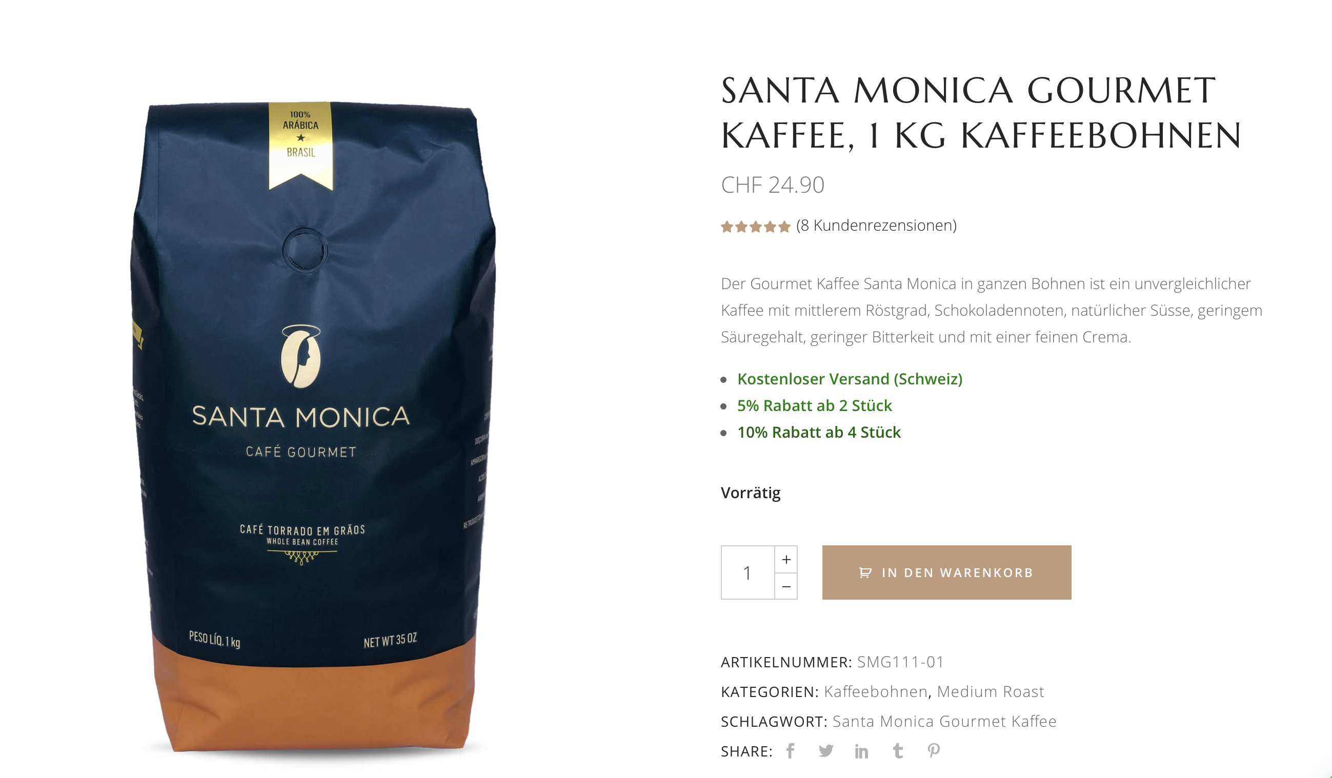 Kaffee Gourmet bietet laut eigener Aussage den besten 100% Arabica Kaffee aus Brasilien in der Schweiz an. Der Kaffee ist komplett frei von Pestiziden und hat wenig Säure und Bitterkeit, dafür einen vollmundigen Geschmack. Sie verkaufen über den Kaffee Online Shop nicht nur Kaffeebohnen, sondern auch gemahlenen Kaffee, Nespresso®-kompatible Kapseln, Drip Coffee Sachets für unterwegs und auch Bio Kaffee.